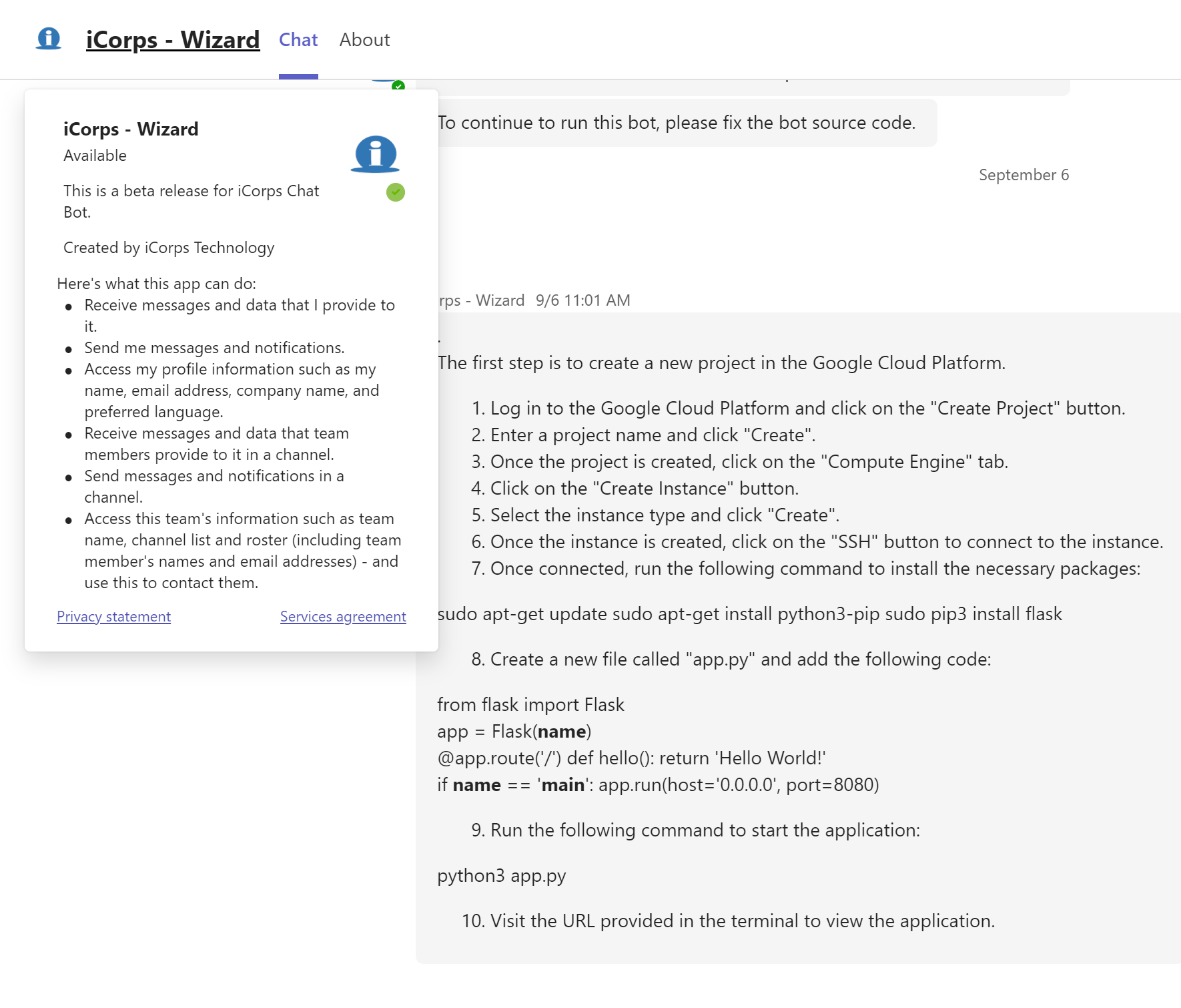 At iCorps, we have implemented the iCorps Wizard, an AI-powered chatbot that can answer technical questions and troubleshoot problems for our customers. The iCorps Wizard is integrated with Microsoft Teams, our collaboration platform of choice, and uses natural language processing (NLP) to understand and respond to customer requests. The iCorps Wizard can also escalate complex issues to our human agents, who can access the chat history and context to provide seamless support.