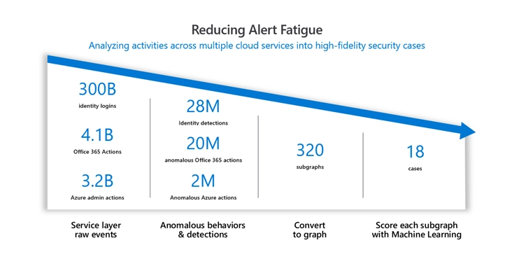 When Microsoft was developing Sentinel, they received feedback from customers that were spending more time on deployment and maintenance of SIEM solutions than on actual threat detection and mitigation. Sentinel functions as an SOC across the enterprise, meaning teams will be able to focus on detection and response while Sentinel’s automation tackles the more tedious tasks. The chart below, taken from Microsoft’s blog, gives an example of how Sentinel’s AI can analyze immense amounts of data quickly and present only the notable events.